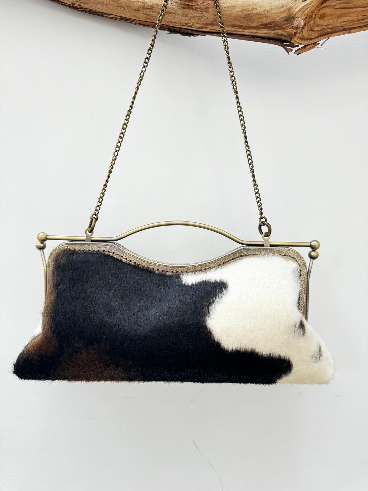 Baguette realizzata in eco pelliccia animalier color burro, testa di moro e nero, fodera in raso.