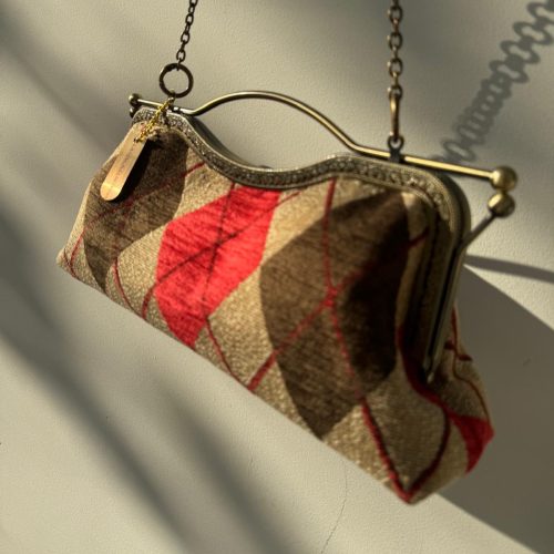 Borsa realizzata in un prezioso e robusto tessuto da tappezzeria a rombi color écru, rosso e marrone, con fodera.