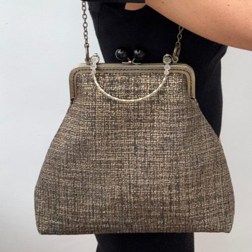 Borsa realizzata in un prezioso e robusto tessuto tecnico da tappezzeria, rigido al tatto, nero e oro con pomelli neri, fodera in raso e tracolla corta a spalla.