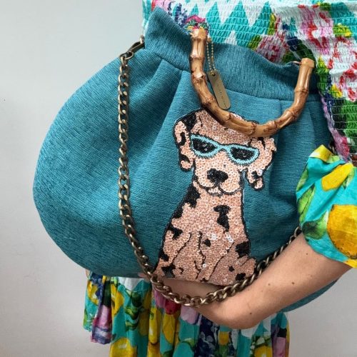 Borsa realizzata in un tessuto da tappezzeria turchese con applicazione in micro paillettes, fodera in raso, taschina interna, tracolla a spalla.
