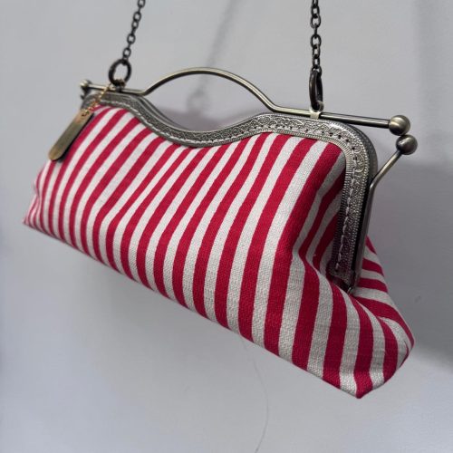 Baguette realizzata in un robusto tessuto da tappezzeria a righe rosso e panna con fodera in raso e tracolla a spalla corta.