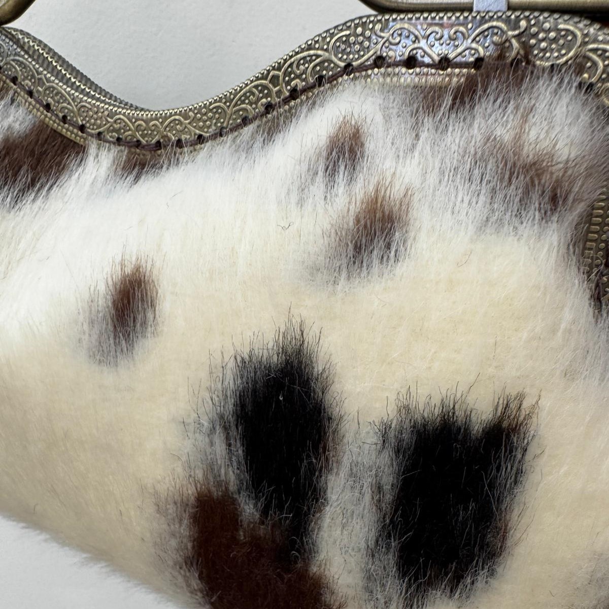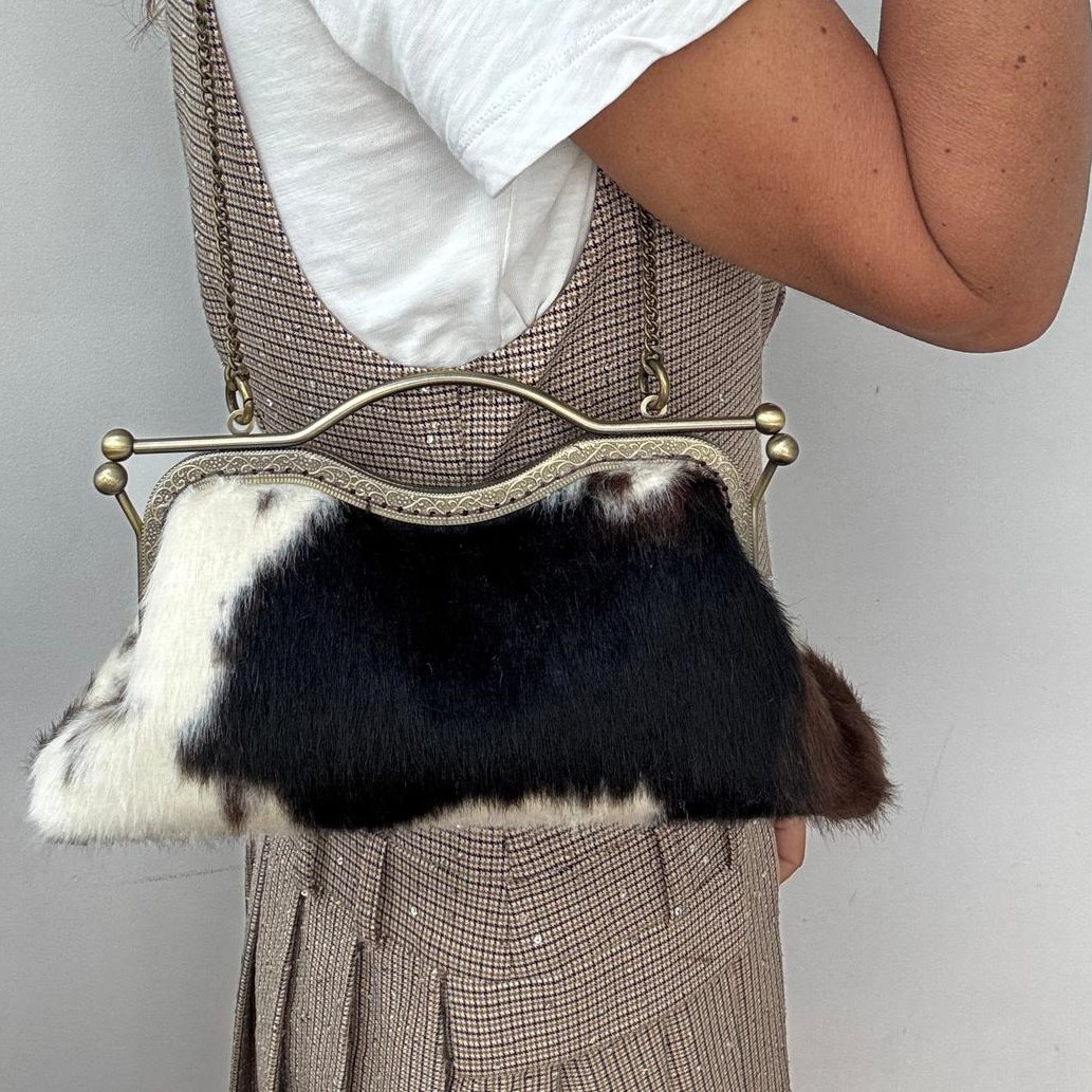Baguette realizzata in eco pelliccia animalier color burro, testa di moro e nero, fodera in raso.