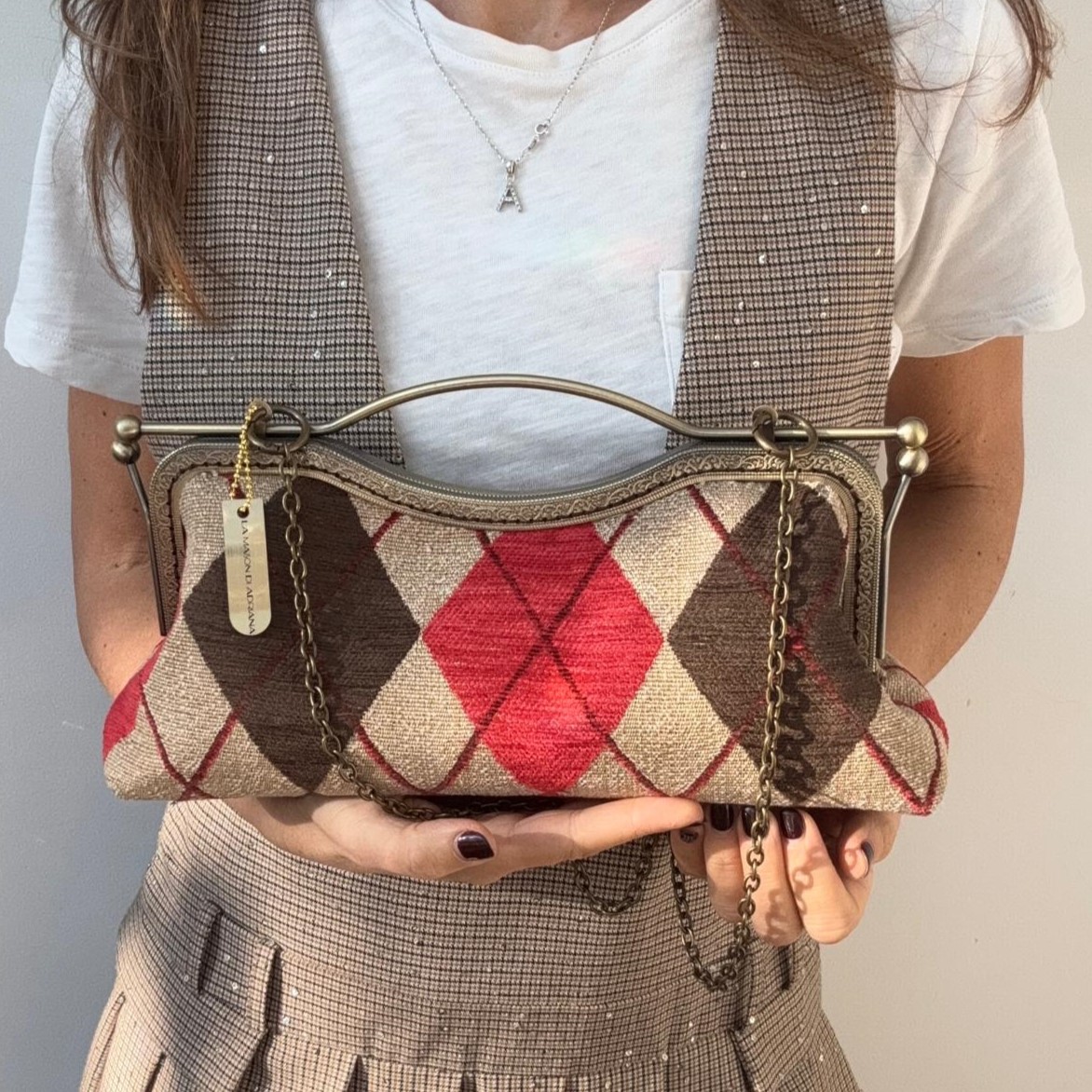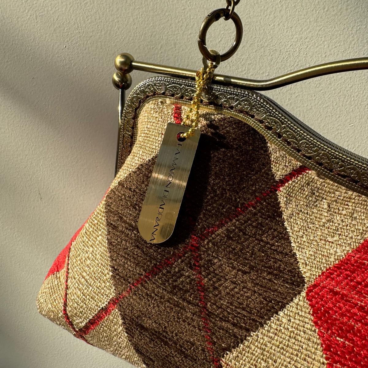 Borsa realizzata in un prezioso e robusto tessuto da tappezzeria a rombi color écru, rosso e marrone, con fodera.