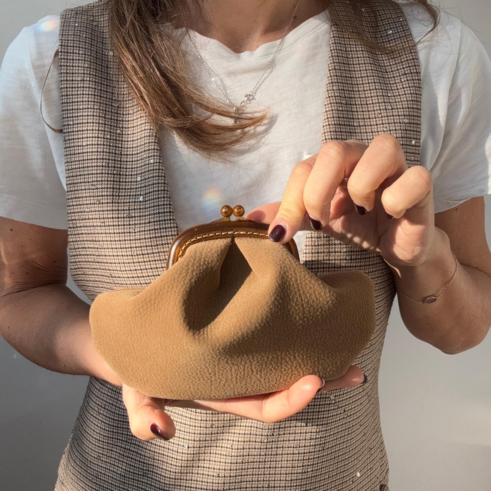 Maxi porta monete in similpelle color cammello, e fodera in raso.