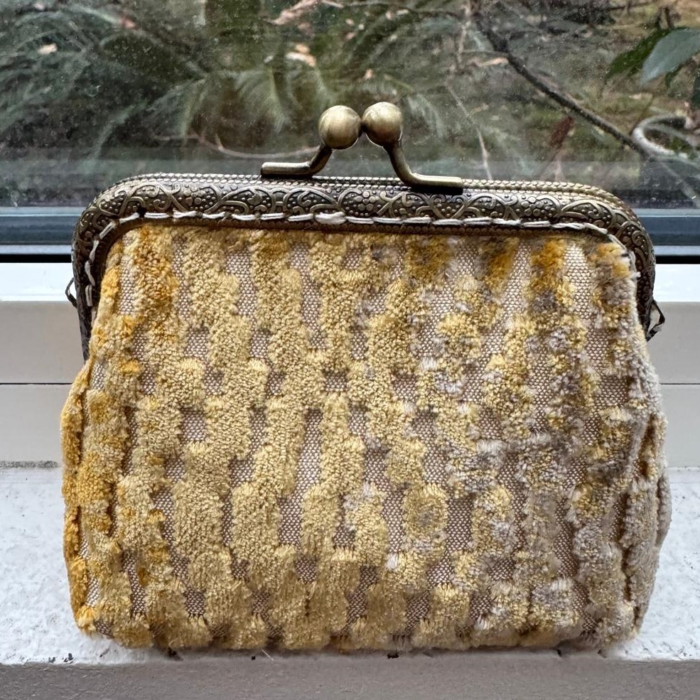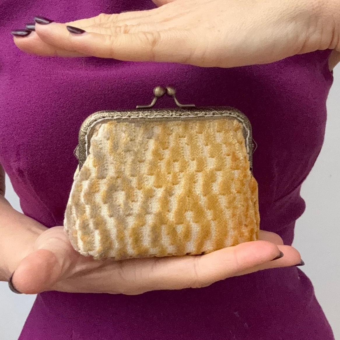 Portamonete realizzato in un prezioso velluto jacquard sui toni dell’oro, grigio e ocra con fodera in raso.