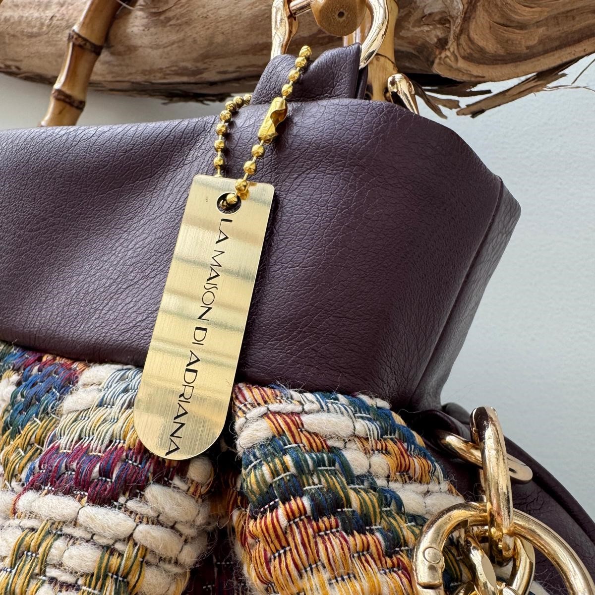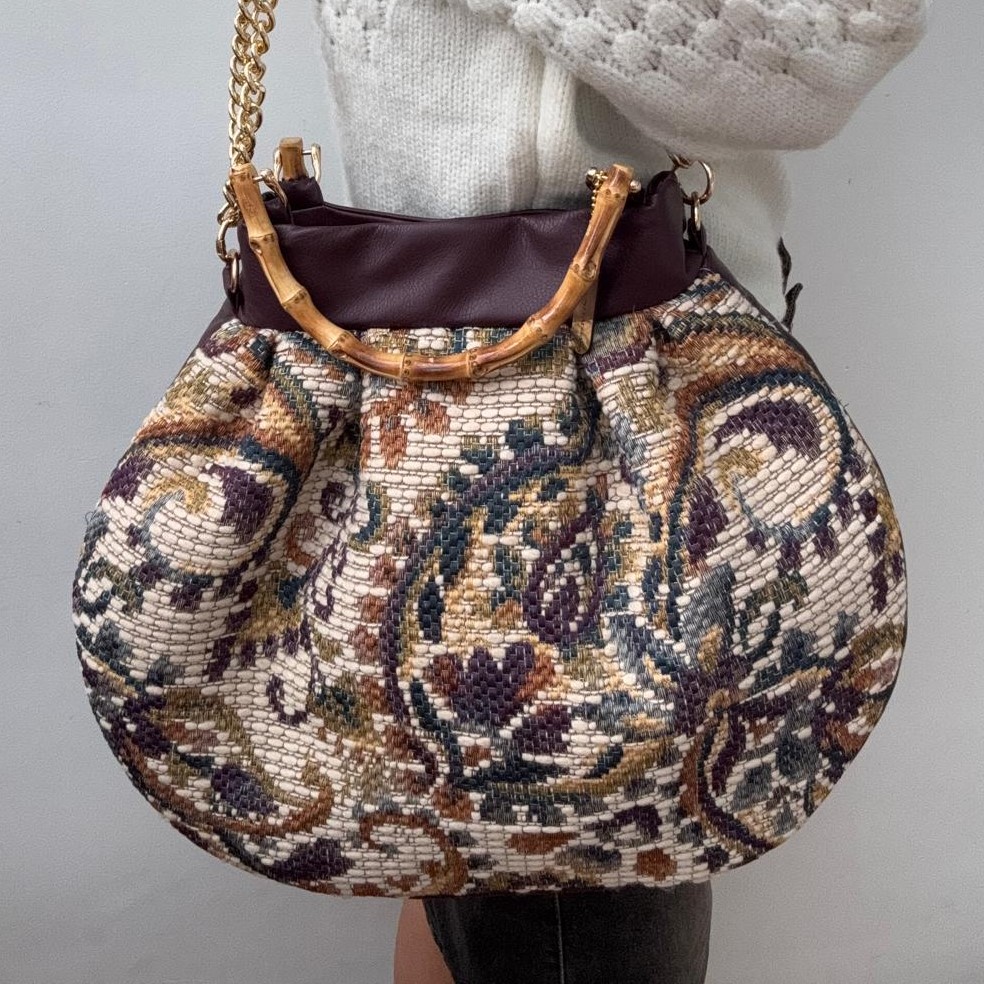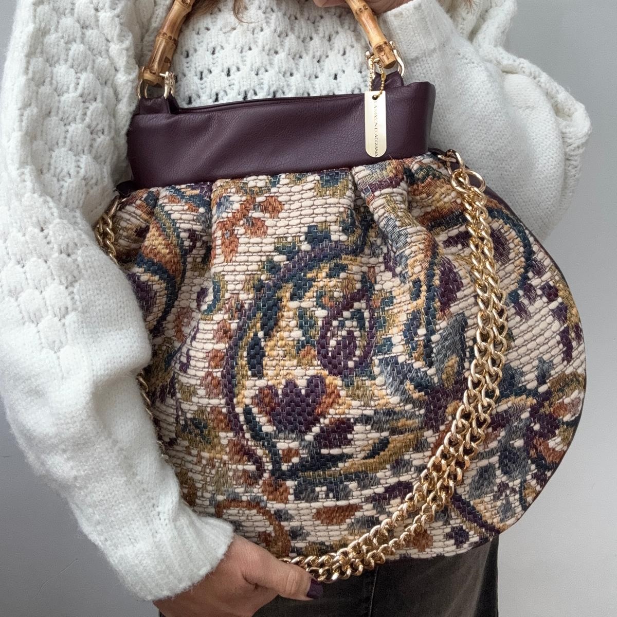 Maxi bag realizzata come unico esemplare in un prezioso tessuto jacquard accoppiato ad una morbida similpelle color vino effetto nappa.