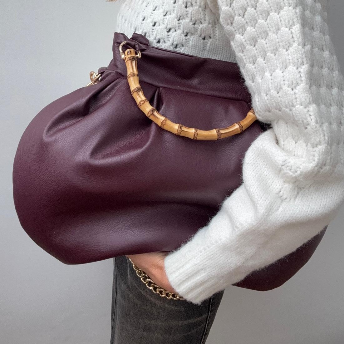 Tracolla lunga 110 cm, manico in bamboo, fodera in raso, taschina interna.