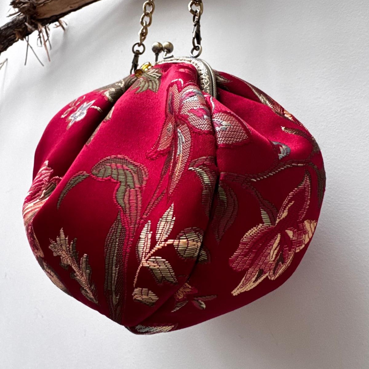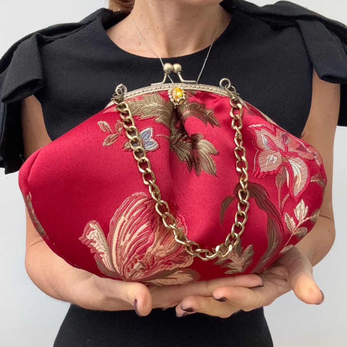 Borsa gioiello in tessuto jacquard rosso con applicazione a mano con cristalli, fodera in raso. taschino interna e tracolla corta.