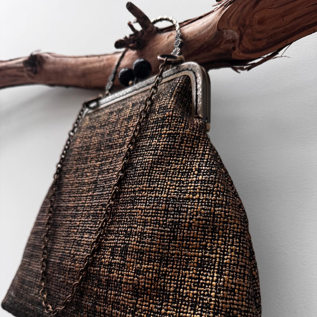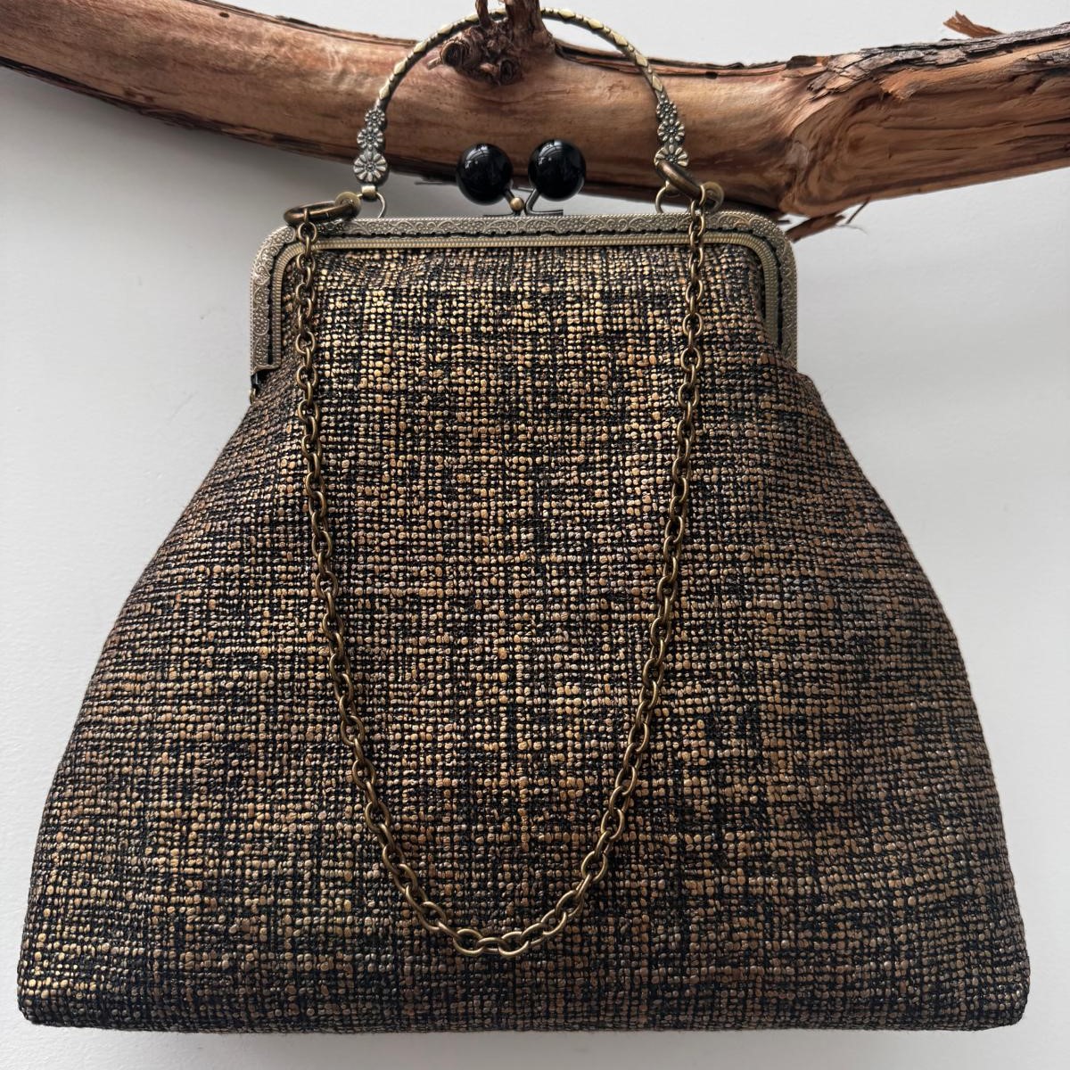 Borsa realizzata in un prezioso e robusto tessuto tecnico da tappezzeria, rigido al tatto, nero e oro con pomelli neri, fodera in raso e tracolla corta a spalla.