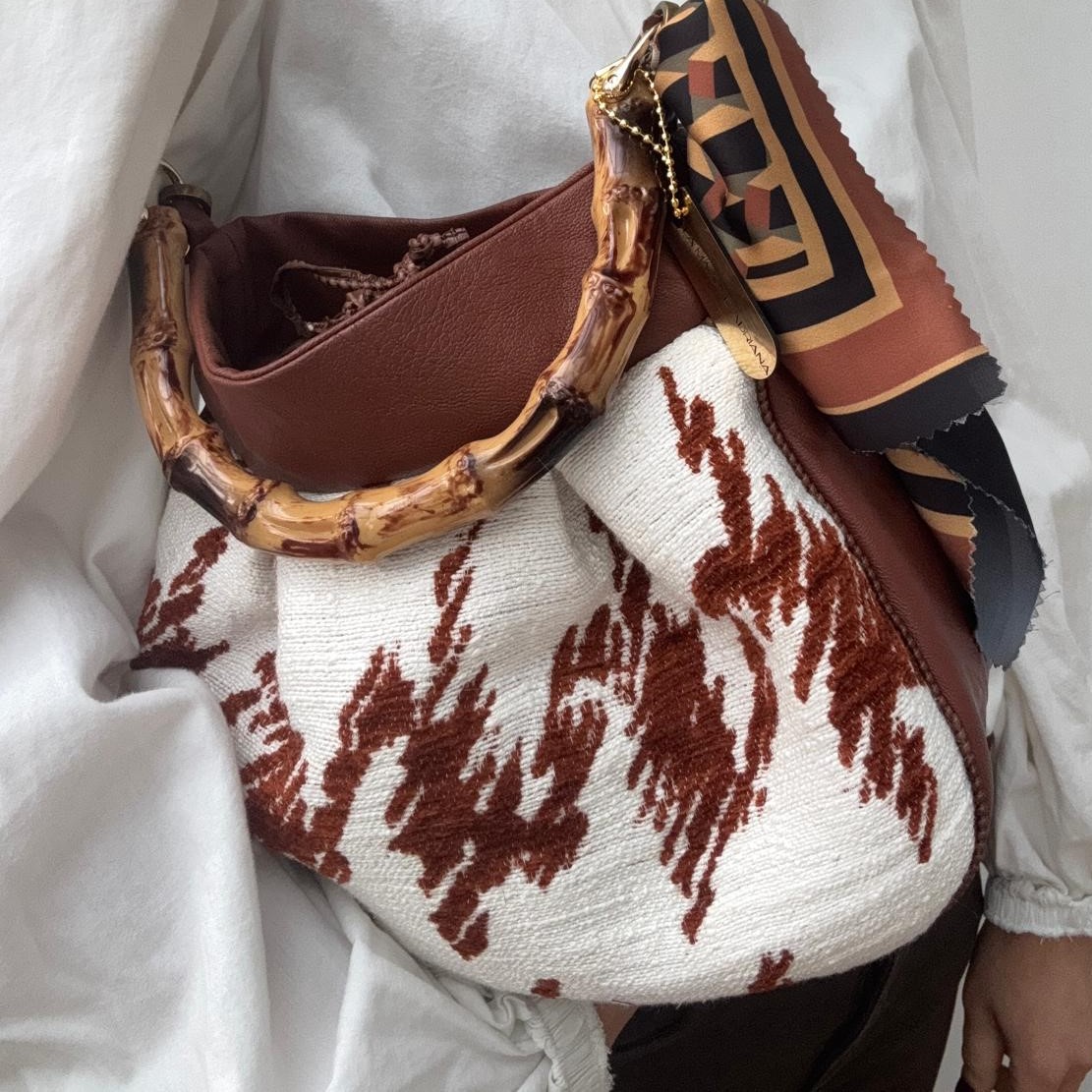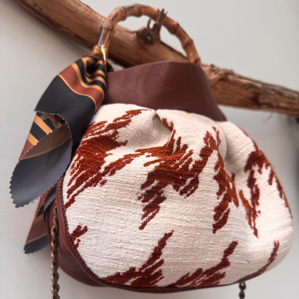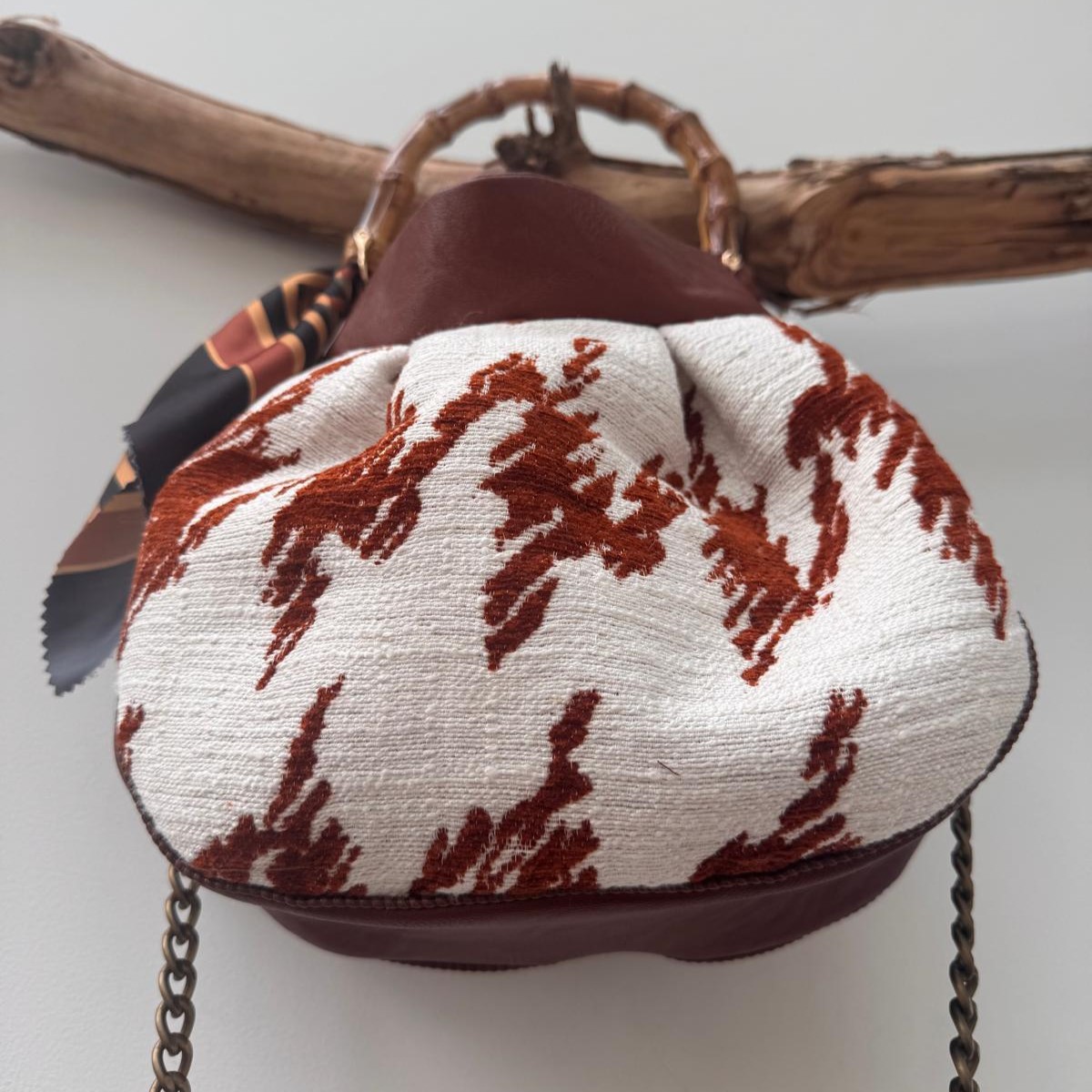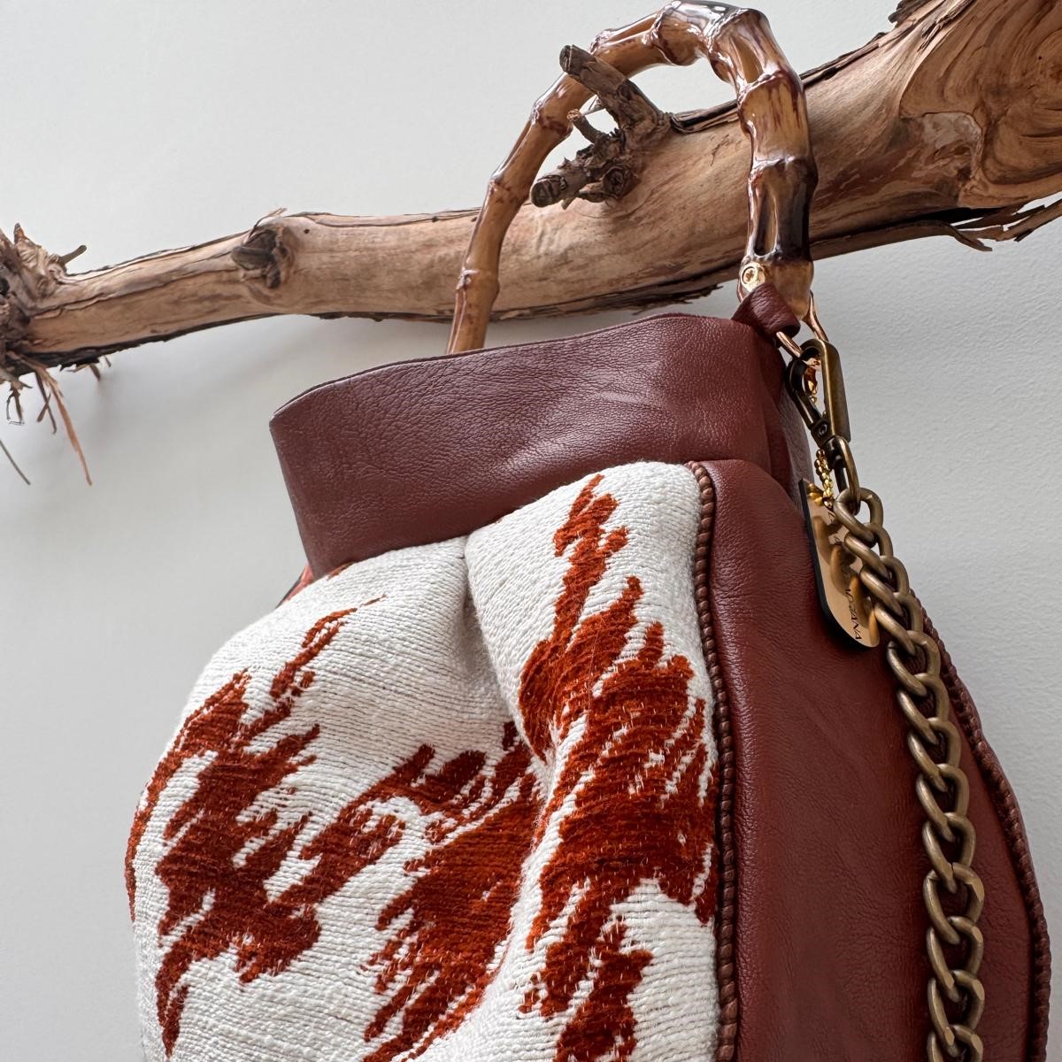 Borsa realizzata in un robusto tessuto da tappezzeria bianco e ruggine con tessuto in similpelle color ruggine, piccolo foulard, fodera interna.
