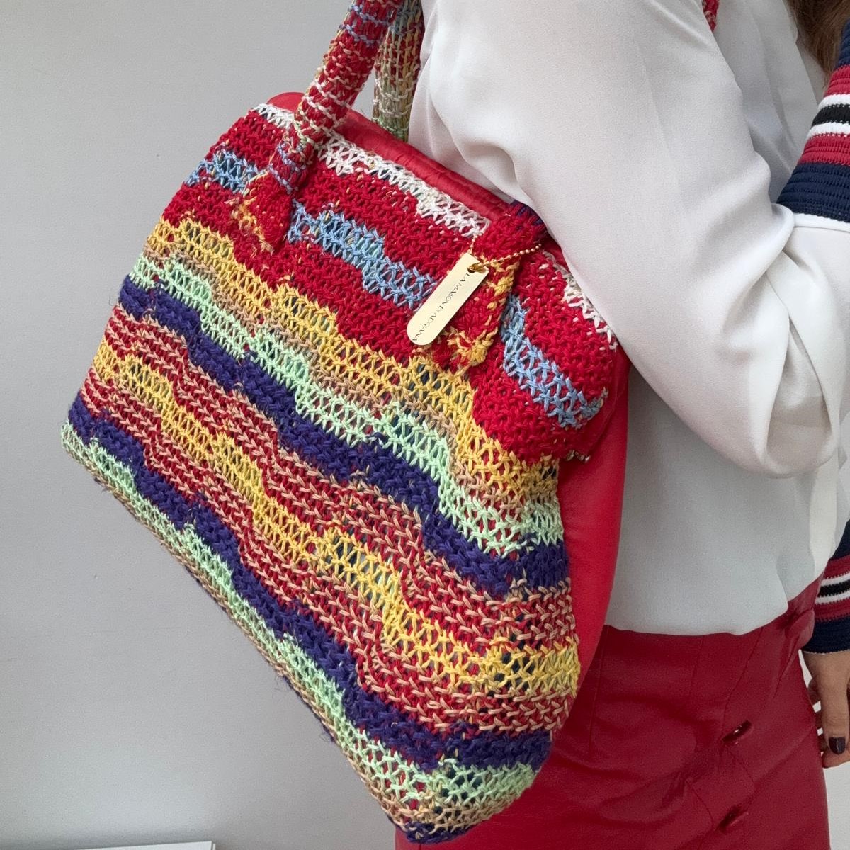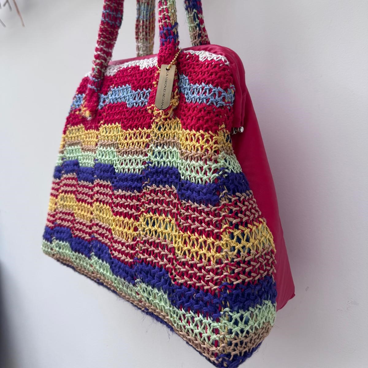 Borsa realizzata in tessuto in maglia multicolor ed ecopelle a contrasto rossa, manici a spalla, fodera e taschina in raso.
