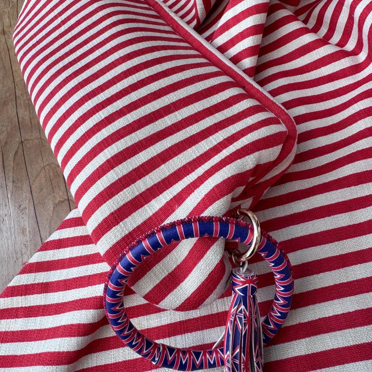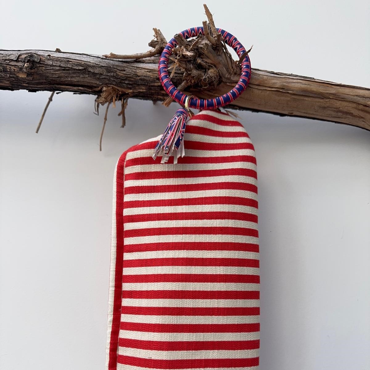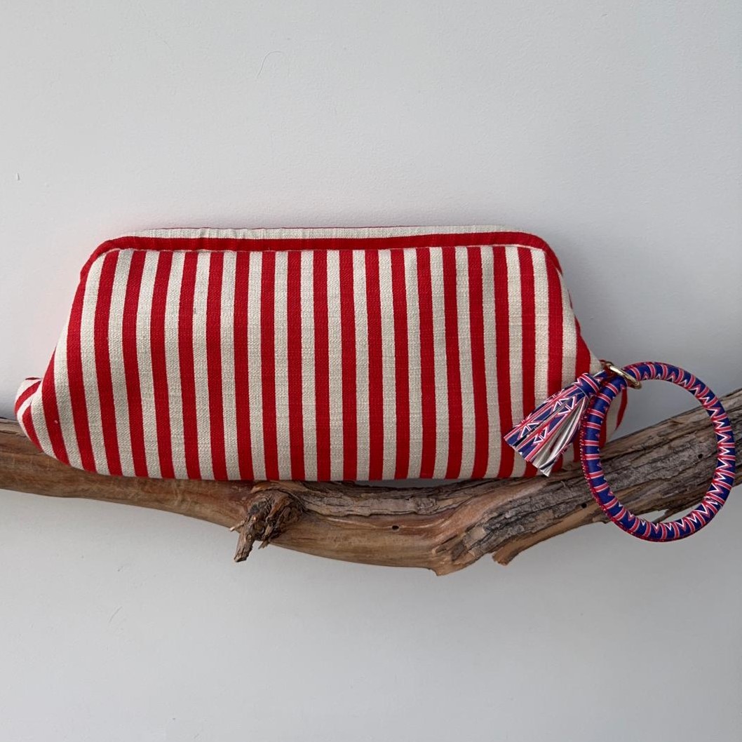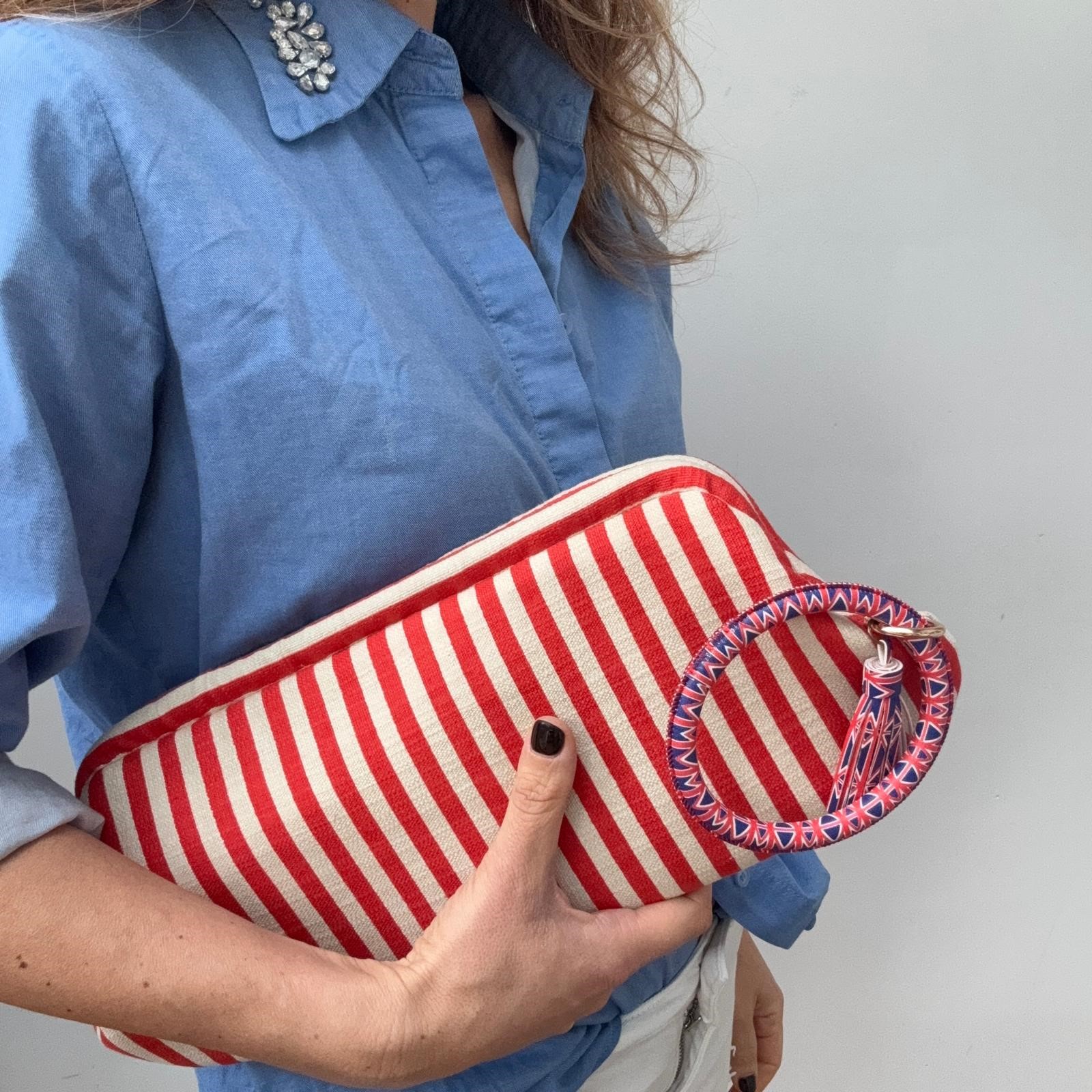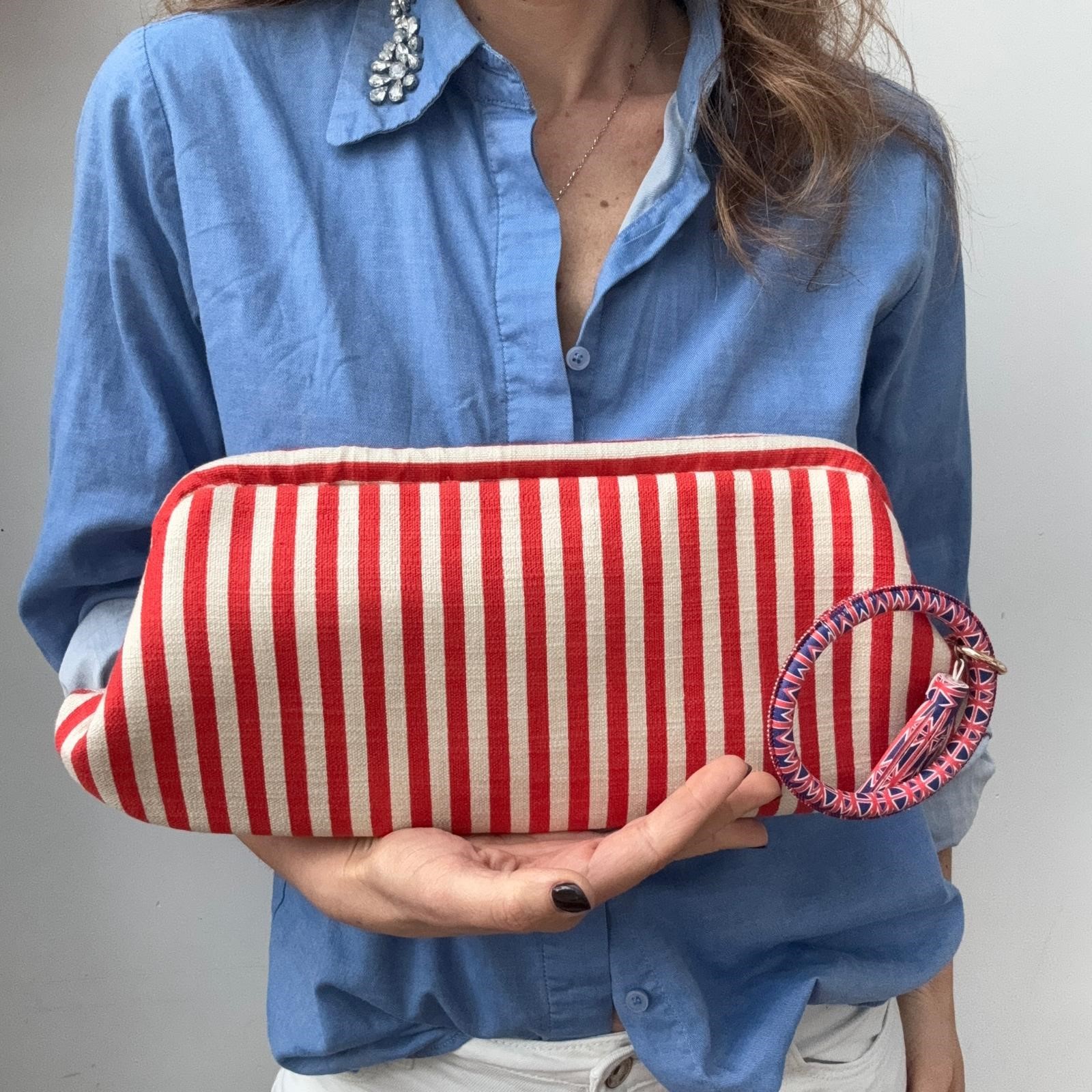 MAXI baguette realizzata in un robusto tessuto canvas di cotone color panna e rosso, struttura rigida e fodera in raso