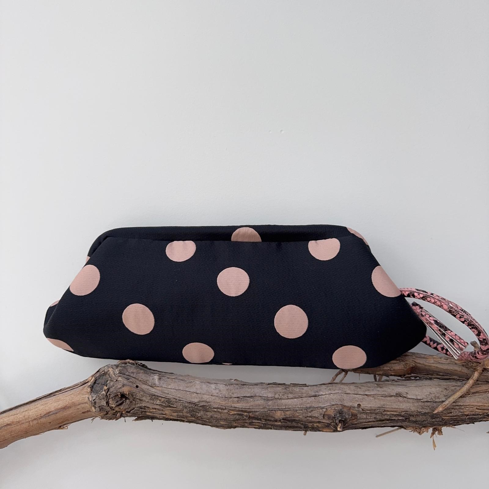 Baguette nera con pois rosa, struttura rigida fodera in raso, manico in ecopelle rosa pitonato, fodera in raso.