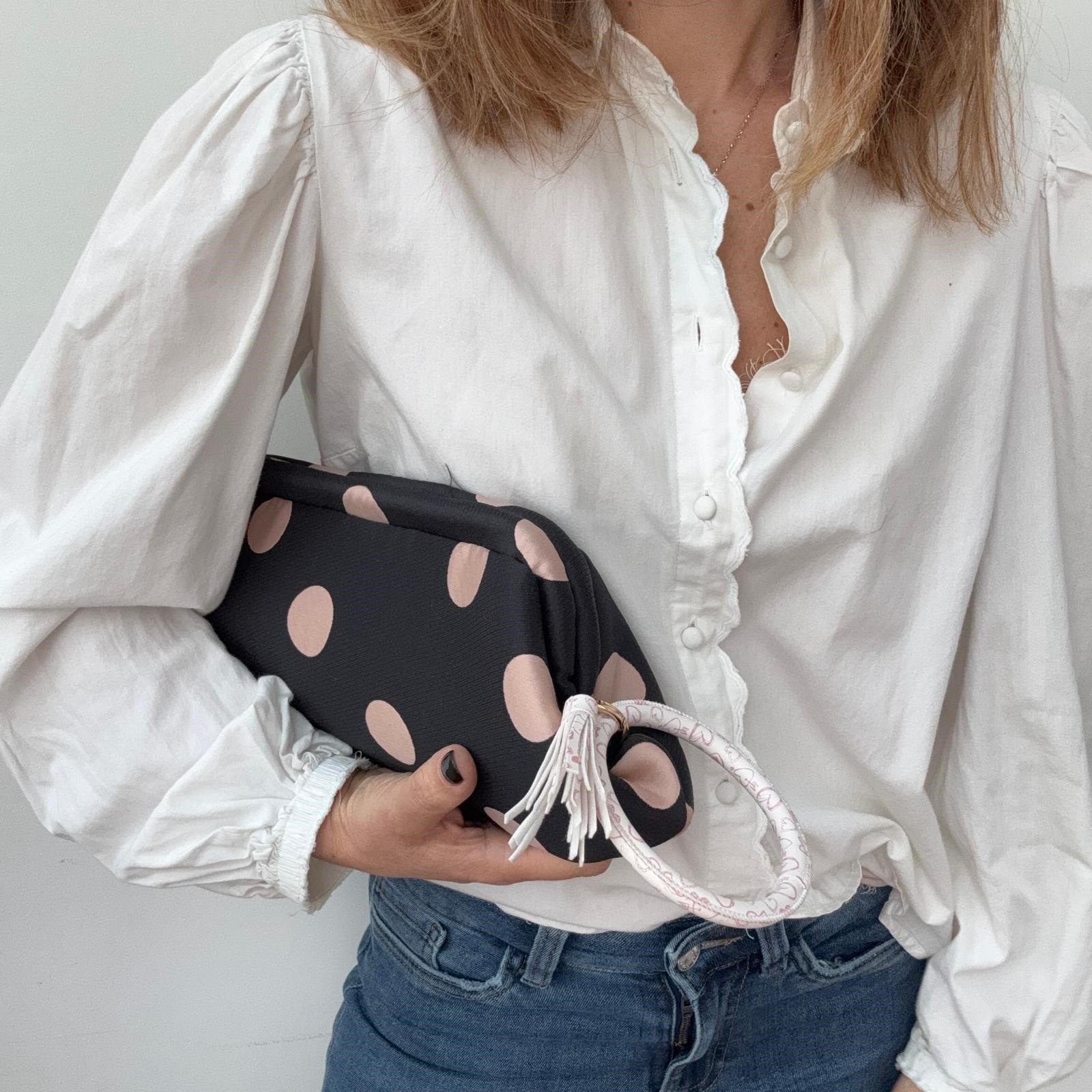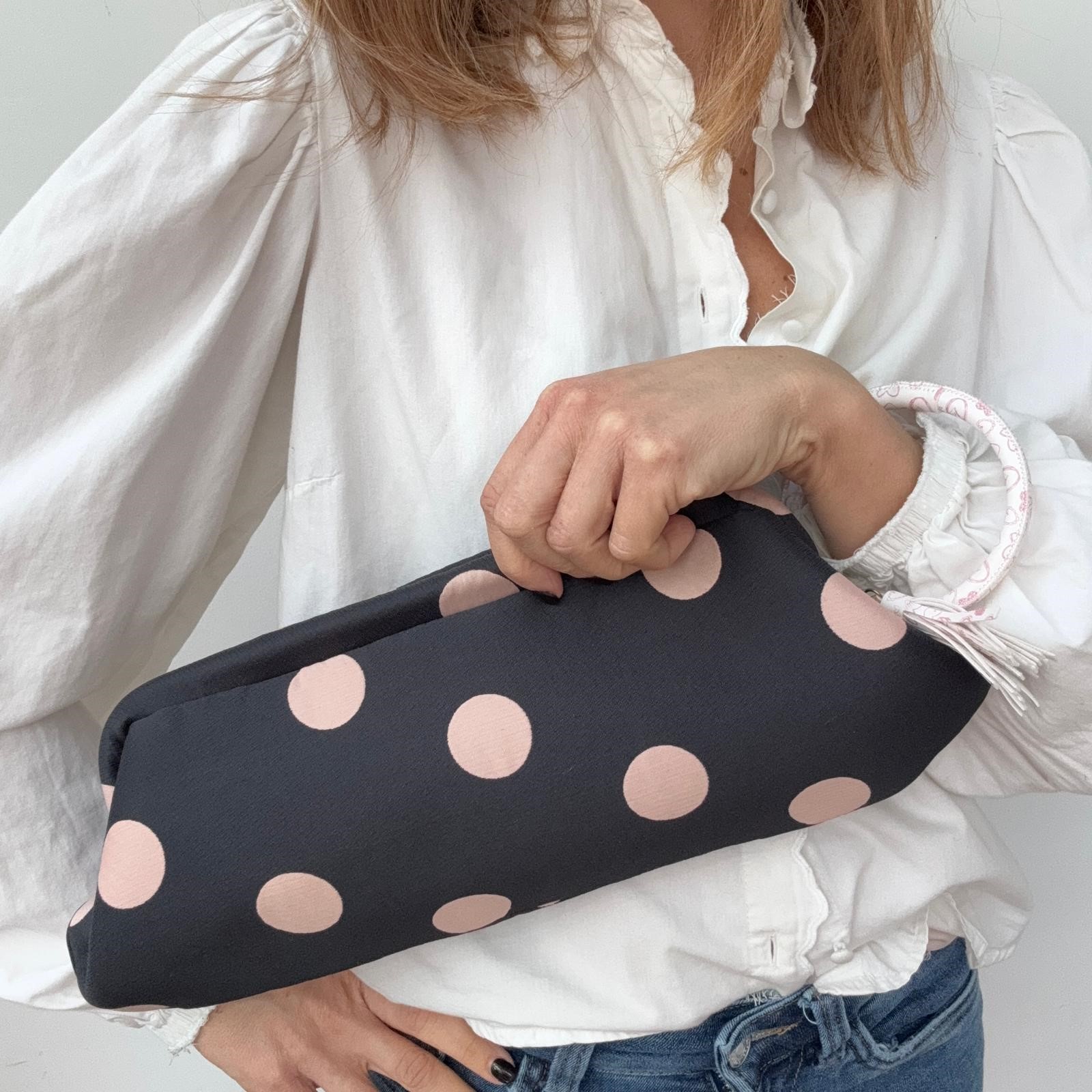 Baguette in tessuto nero con maxi pois rosa, struttura rigida, fodera in raso.