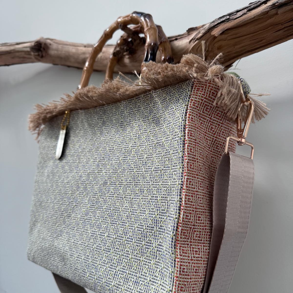 Tote bag multicolor gialla, lavanda, rossa, turchese, verde con manici in bamboo.