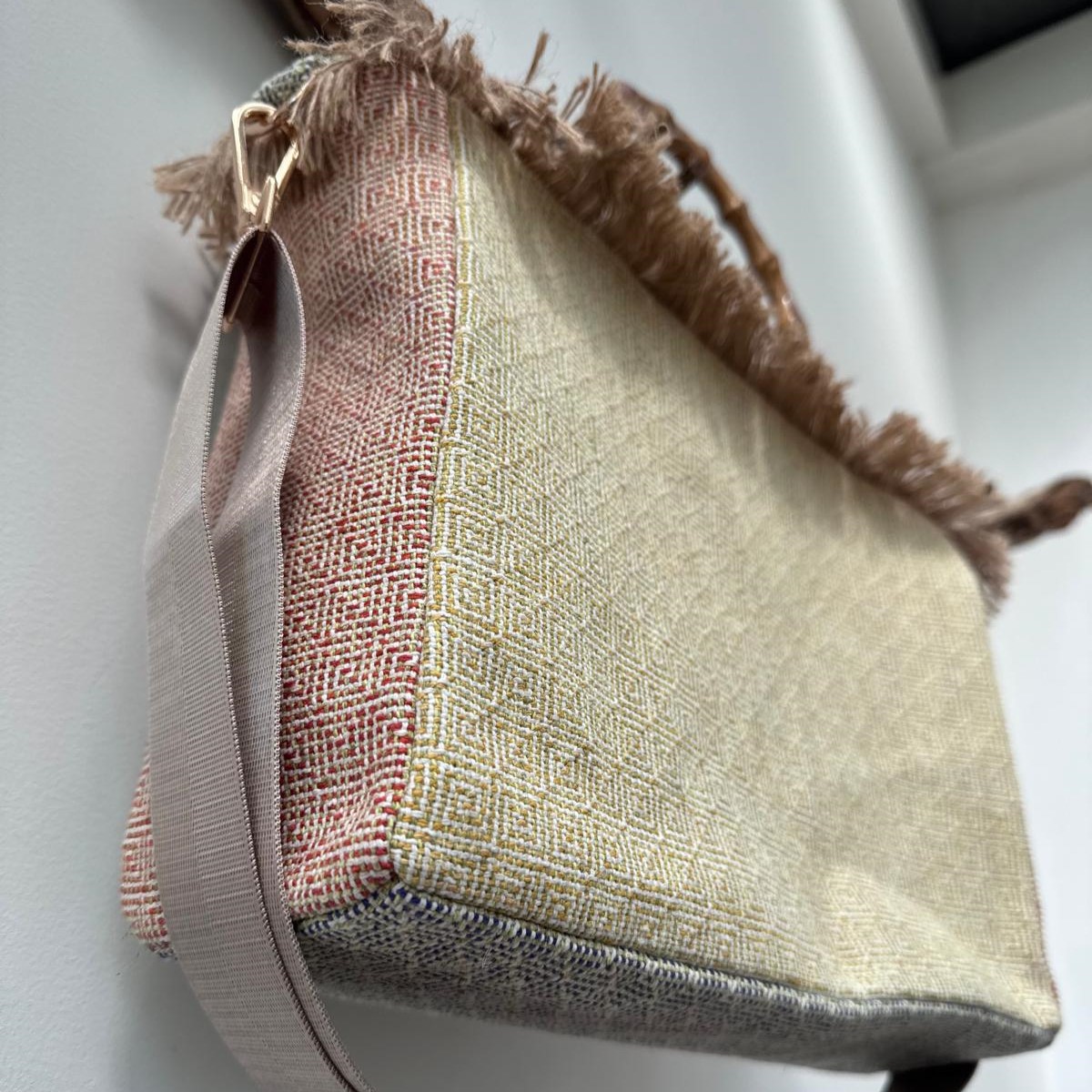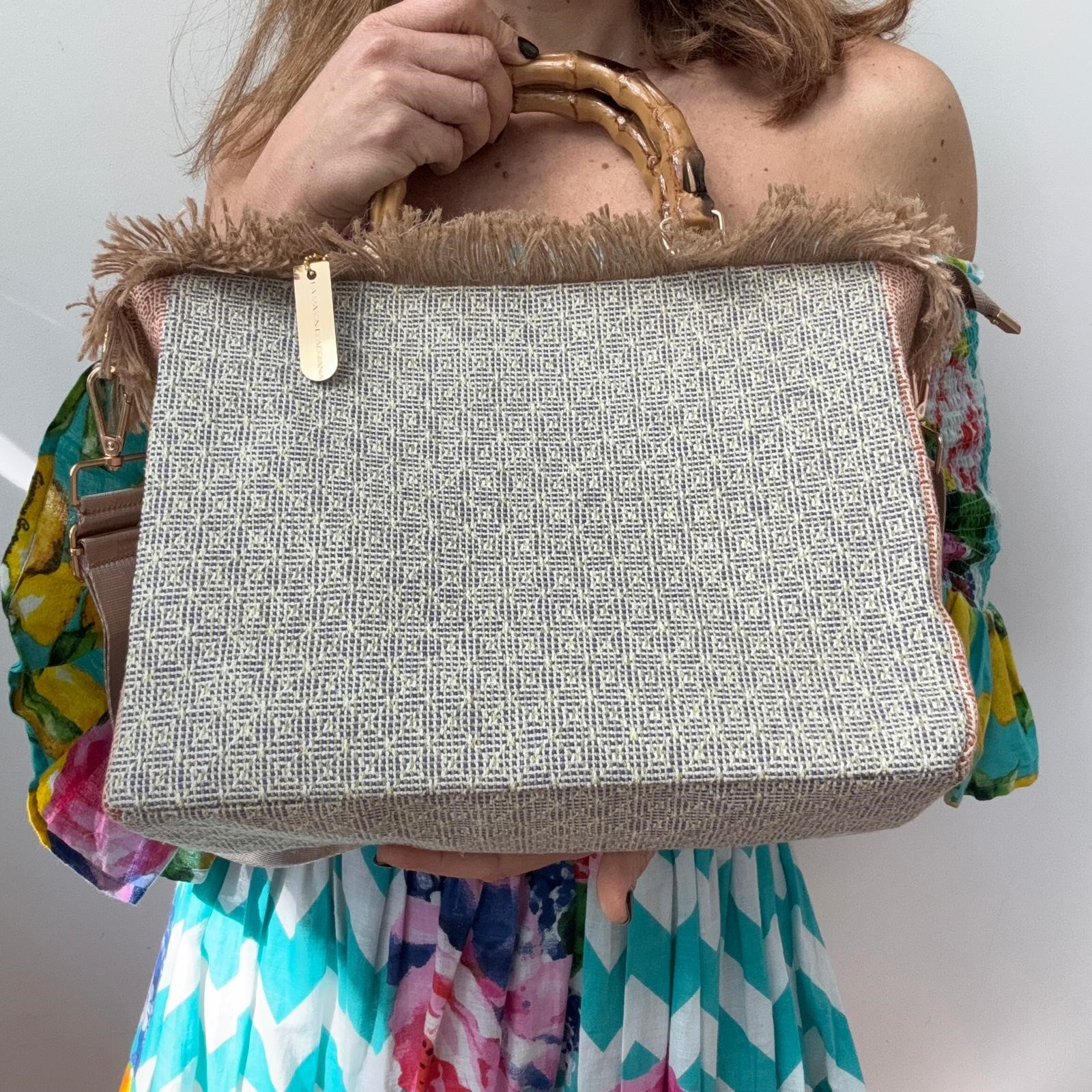 Bauletto in jeans beige chiaro e scuro a contrasto, con manici in tessuto, toppe cucite, fodera in raso, taschina interna.
