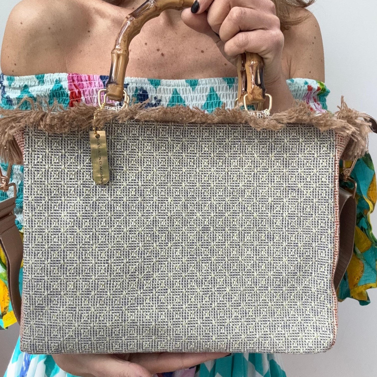 Manico in rafia e decorazione in rafia, zip, fodera in raso e taschina.