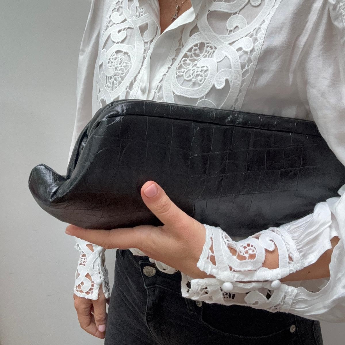 Baguette realizzata in ecopelle nera effetto coccodrillo, fodera in raso.