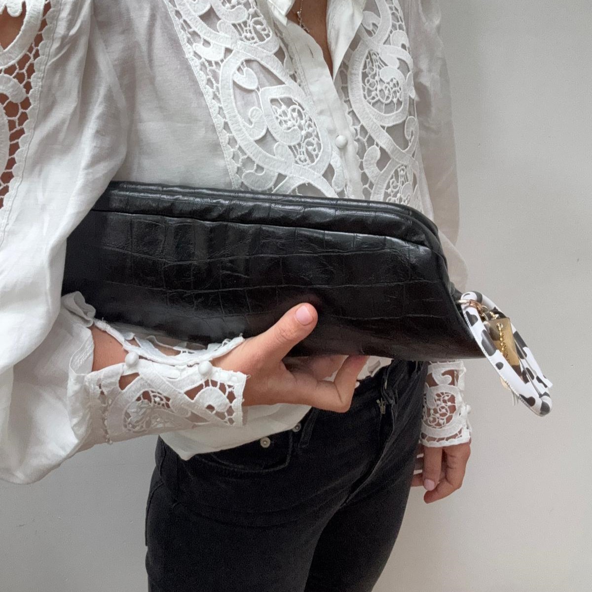 Midi bag realizzata in un prezioso tessuto da tappezzeria bianco écru e nero, con fodera in raso.