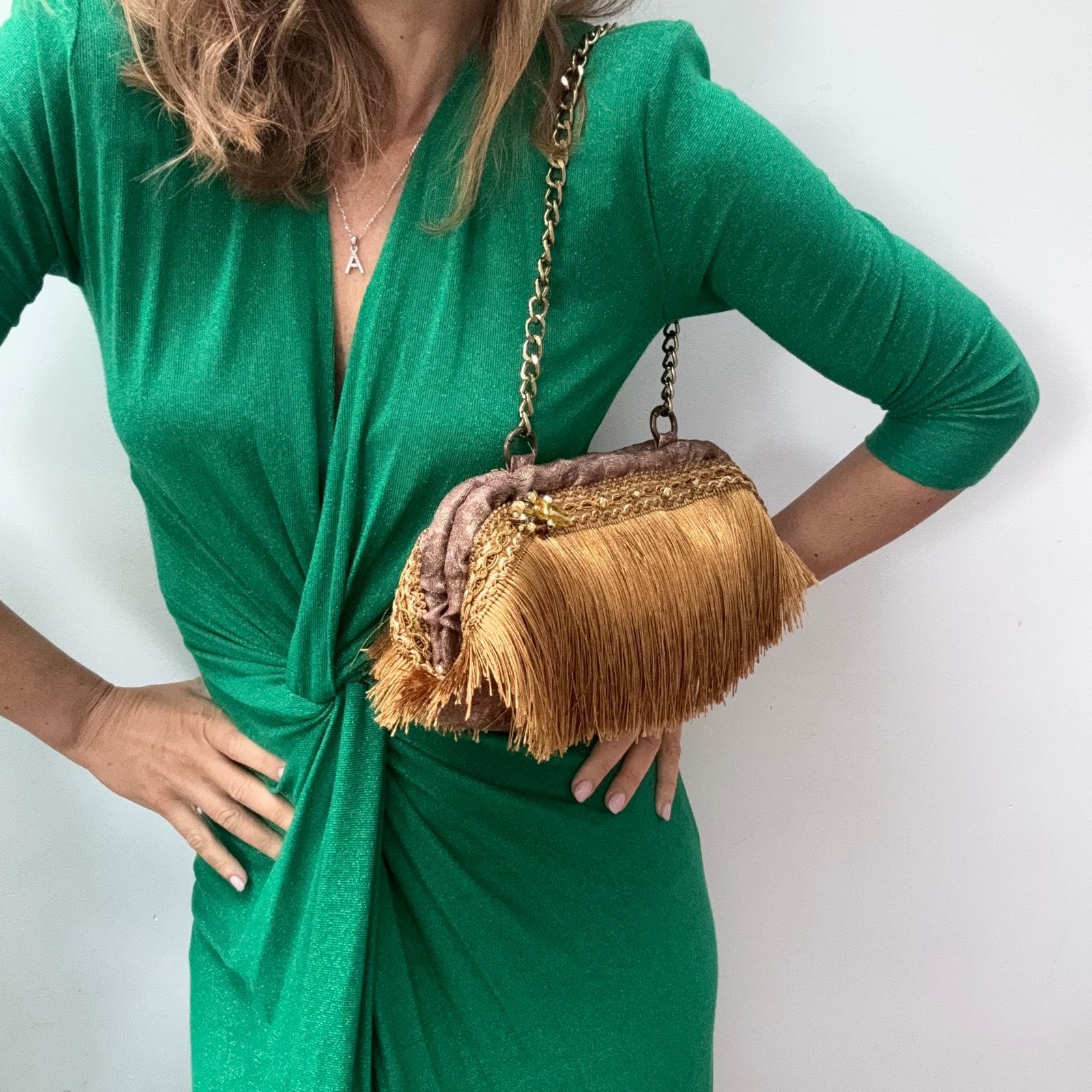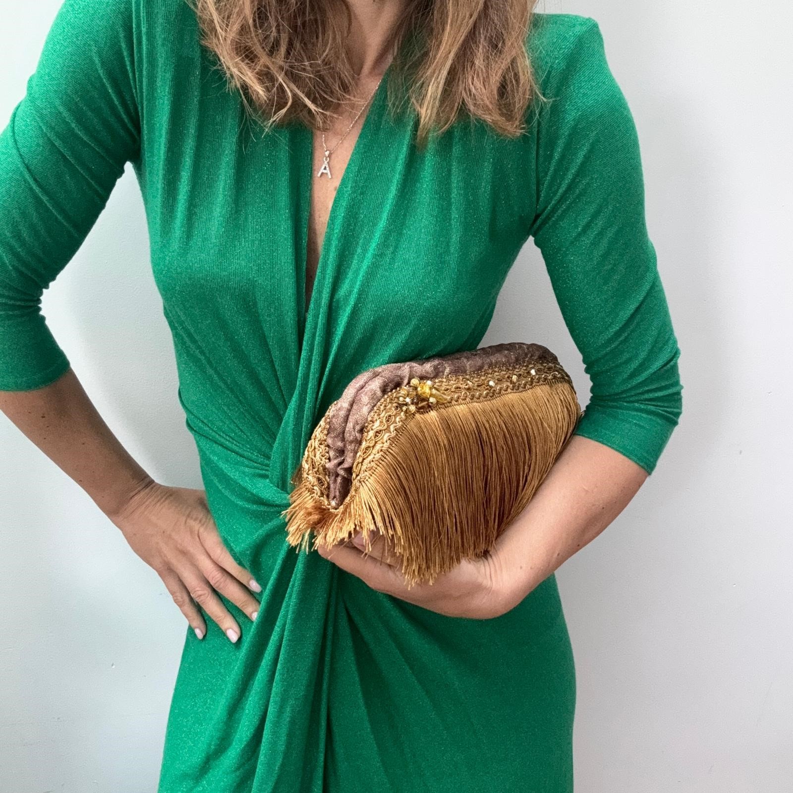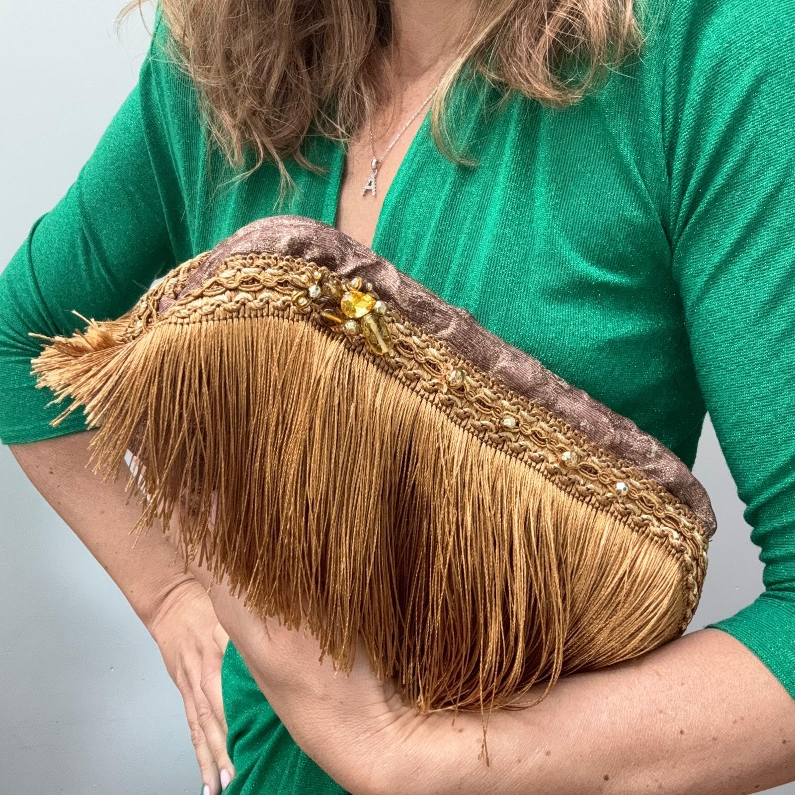 Baguette realizzata in tessuto color bronzo e oro, frange color oro, passamaneria preziosa ed applicazione gioiello cucita a mano.